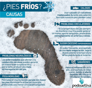 El sudor frecuente, acompañado de una mala evaporación, bajará drásticamente la temperatura de los pies durante el invierno. En esta infografía recopilamos las causas más habituales de los pies fríos:
