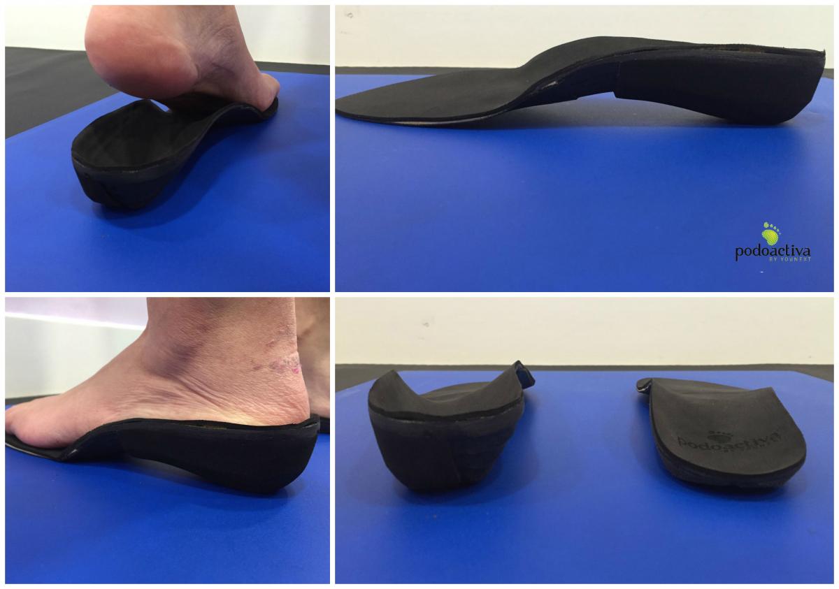 Después de realizar el estudio biomecánico se realizó el molde plantar digital de la paciente con el 3D Scan Sport Podoactiva. El tratamiento busca envolver al máximo el apoyo del talón y posicionar la articulación del tobillo y subastragalina de la manera más neutra posible. En el diseño de la plantilla izquierda se contiene de una forma más marcada todo del arco interno y externo del pie. Además, se añade un control intrínseco diseñado en el talón para que el impacto lateral no sea muy marcado.