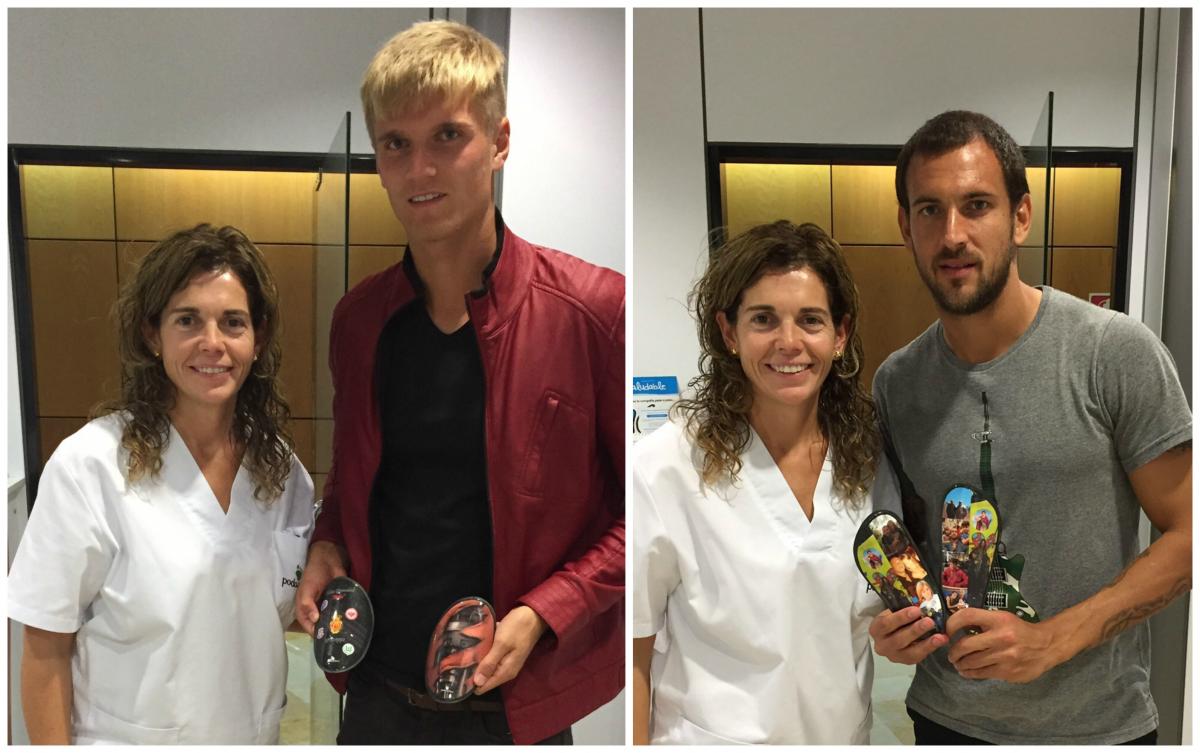 Tobías (izquierda) y Aveldaño (derecha), jugadores del RCD Mallorca con Conchi Salom, podóloga responsable de Podoactiva Palma