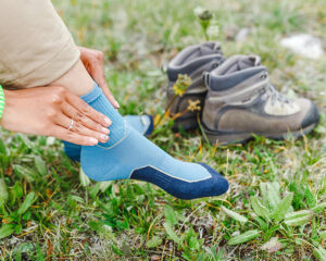 Es mejor utilizar calcetines que no llevan costuras y de composición mixta (sintéticos y de algodón). El material sintético es más elástico y permite transpirar mejor el pie, mientras que el algodón favorece la absorción del sudor y el confort.