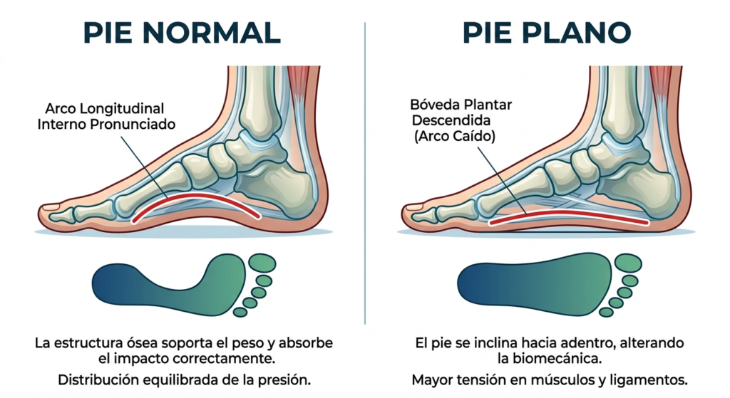 Desde una perspectiva biomecánica, esto implica que el eje del pie se inclina hacia dentro (pronación), lo que altera la distribución del peso corporal durante la marcha.