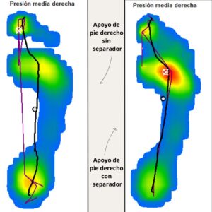 Esto se objetiva cuando realizamos un estudio dinámico (caminando) con los separadores puestos sobre la plataforma de presiones. Vemos que al no poder realizar un despegue eficiente, se genera una sobrecarga metatarsal central al usar los separadores. Esa sobrecarga mantenida en las cabezas del segundo y tercer metatarsiano pueden generar otras patologías a medio plazo.