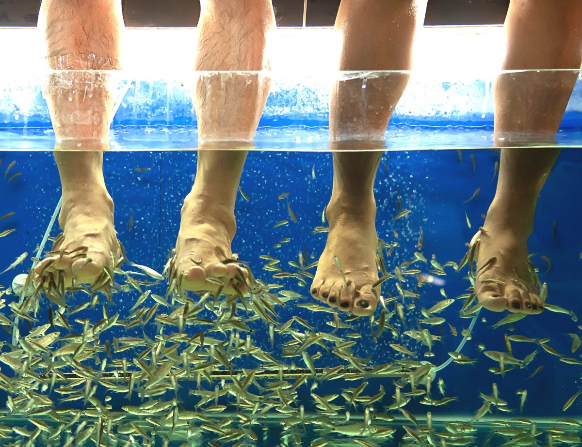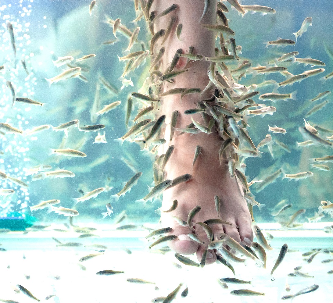 Sumergir los pies en un pequeño tanque de agua, donde unos peces llamados “Garra Rufa” limpian y exfolian las células muertas de la piel de los pies.